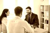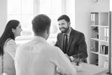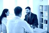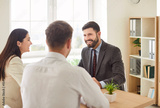 Group of three young confident business people discussing a work project on a meeting. Coworkers and company employees talking with male colleague sitting at the desk in office. Team work concept.