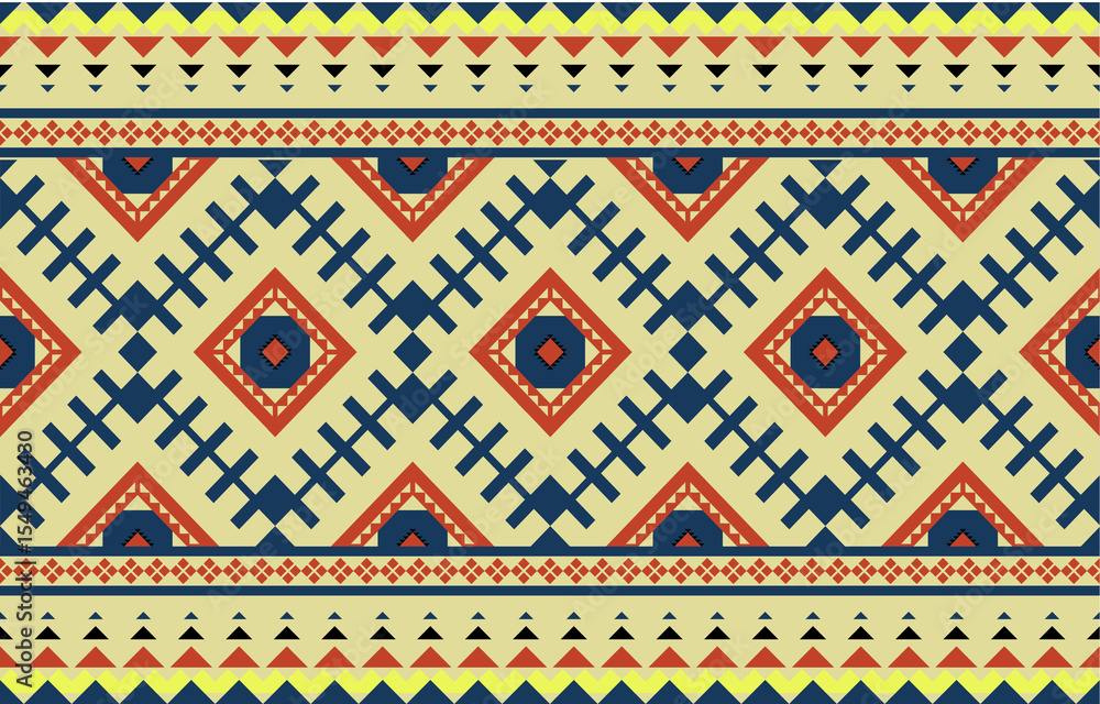 Seamless tribal geometric pattern in vibrant colors. Ethnic style background design, perfect for textiles, wallpapers, or digital prints.
