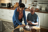 Elderly couple having breakfast in cozy kitchen setting with coffee and pastries, woman pouring coffee, man sitting at table, both engaging in casual conversation