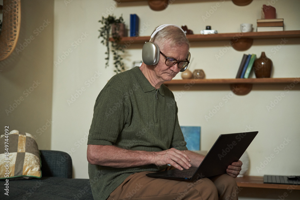 Elderly man wearing headphones and typing on a laptop while sitting on a couch with shelves and decor in background