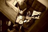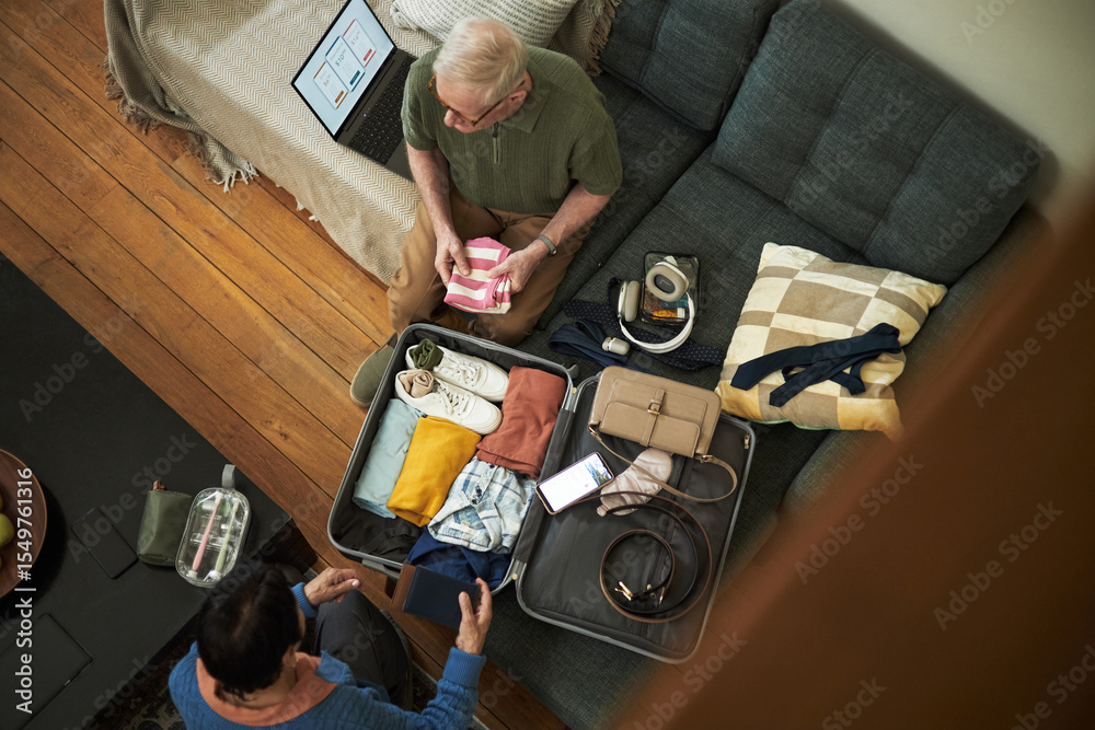 Overhead view of elderly couple diligently packing suitcase on couch with various items carefully arranged for an vacation trip abroad on holiday