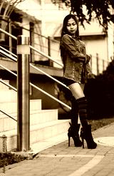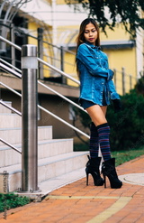 Fashionable pretty young woman wearing blue jeans, and long striped knee socks