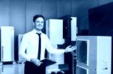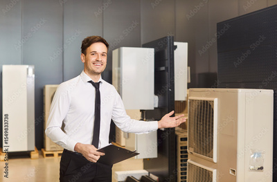 A smiling salesman points to a large air conditioner, close-up. Household appliances store, consultation on choosing a cooling system. Concept portable air conditioning, spot cooling