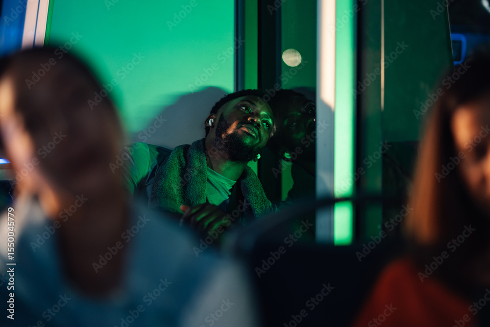 Young man relaxing listening to music on night bus illuminated by green neon lights