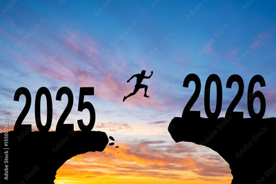 Welcome Merry Christmas and Happy New Year in 2026, Vector silhouette man jumping from 2025 cliff to 2026 cliff with cloudy sky and sunlight. Vector illustration isolated on white background