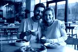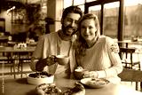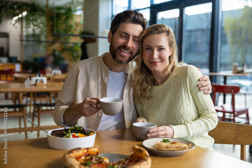 Bearded man and woman enjoying meal at restaurant with pizza and coffee cups