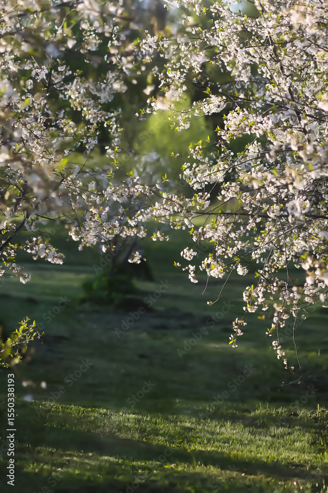 Blooming trees in the spring garden. White flowers on a tree.