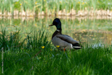 Male Mallard Duck Standing in Green Grass by a Peaceful Pond During Spring