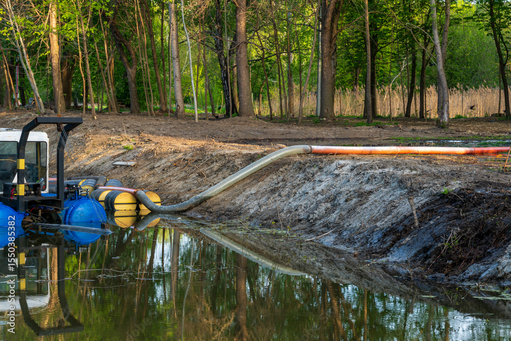 Hydraulic Dredge Pumping Water from a Pond with Reflection in a Forest