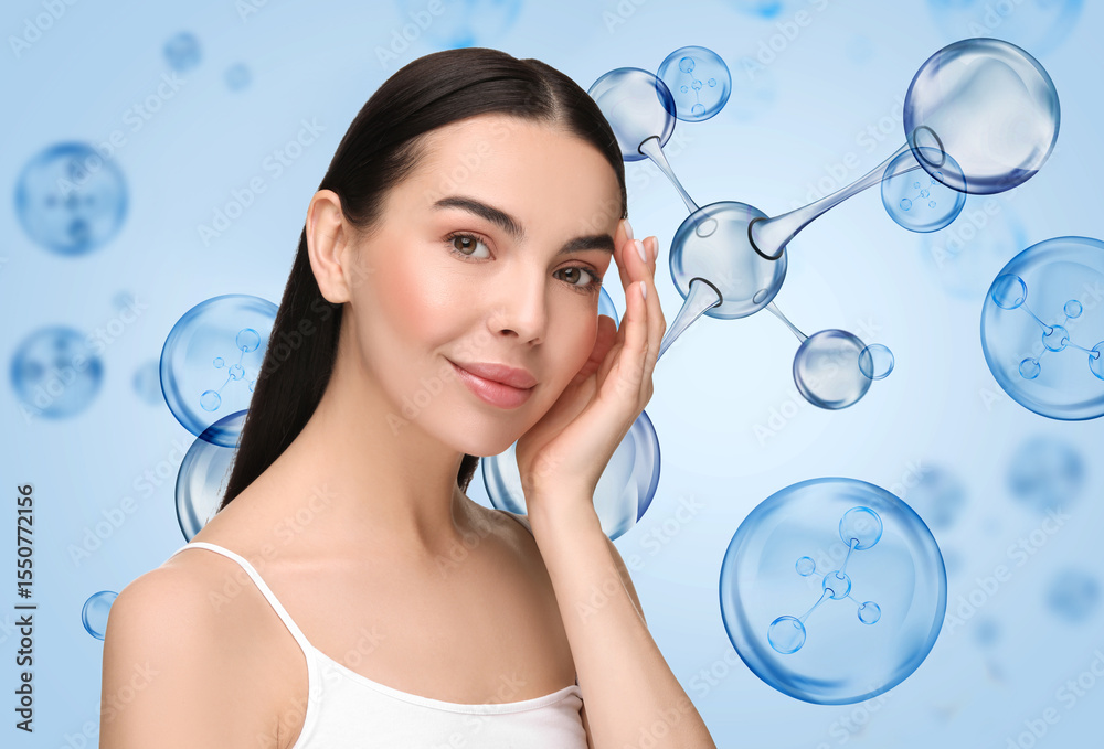 Beautiful woman and collagen molecules on light blue background
