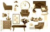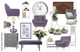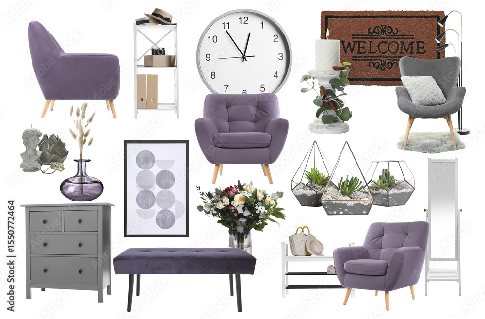 Different furniture and decorative elements on white background, collage. Living room interior with pastel violet color accent