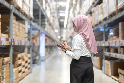 Young muslim women wearing hijab smiles while holding tablet checking goods stock inspacious warehouse. Female islamic worker at large storage facility.