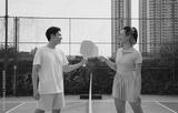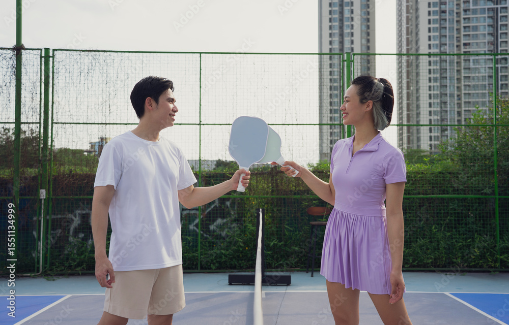 Two players engage in a friendly pickleball match on an outdoor court surrounded by high-rise buildings