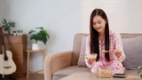 Young Asian woman enjoys a healthy granola breakfast at home promoting wellness and a longevity lifestyle comfortable morning routine for balanced diet