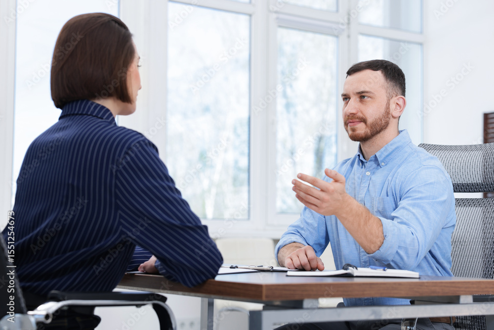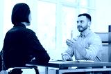 Recruiter and candidate having job interview at desk in office