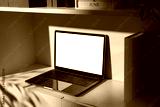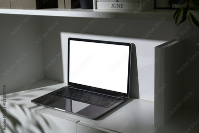 Laptop ready for design display with copy space on screen, framed by neutral tones and light