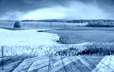 Wooden table with field background