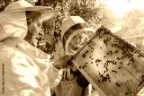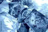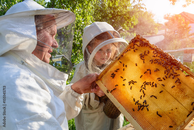 Experienced beekeeper grandfather teaches his grandson caring for bees. Apiculture. The concept of transfer of experience.