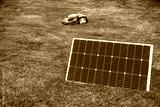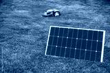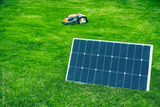 Solar panel generating renewable energy on green grass on a sunny summer day and robotic lawn mower cutting grass in the background.