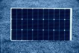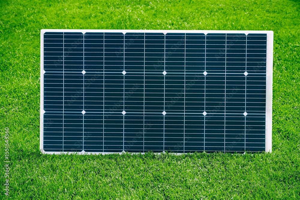 Solar panel generating renewable energy on green grass in a summer sunny day.