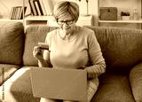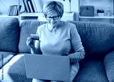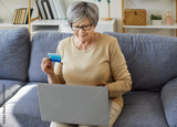 Smiling elderly woman sitting on sofa with laptop on lap and holding credit bank card. Happy senior female pensioner browsing internet outlet, shopping online and enjoying secure internet purchase.