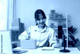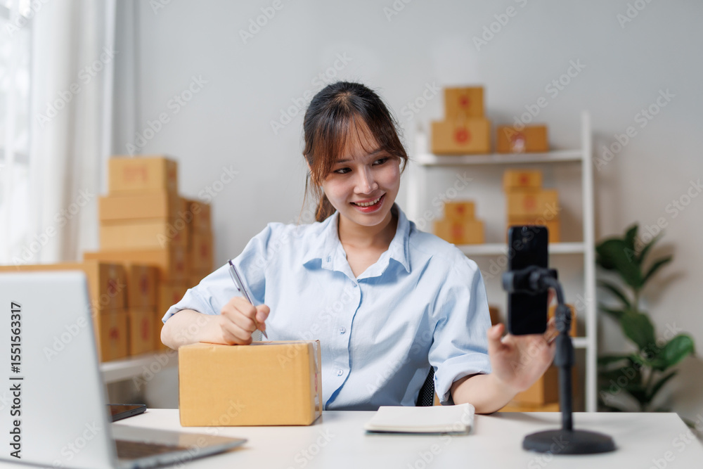 Asian woman preparing packages for delivery and recording video for social media using smartphone
