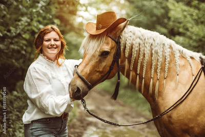 A woman is wearing a cowboy hat while riding a horse in an open field