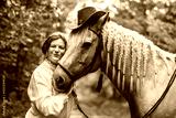 A woman is wearing a cowboy hat while riding a horse in an open field