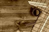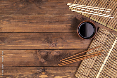 Mat for sushi and chopsticks on wooden background. Top view with copy space