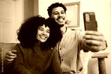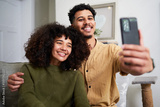 Smiling Couple Sitting Together and Taking a Selfie at Home in a Comfortable Living Space