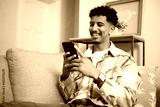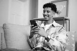 Smiling Man Relaxing at Home While Using Smartphone on Couch