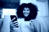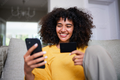 Happy Young Woman Sitting on a Couch Making an Online Purchase with Smartphone and Credit Card