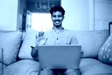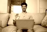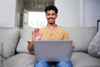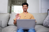 Friendly Young Man on a Video Call at Home Using Laptop, Smiling and Waving