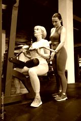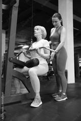 Senior woman training on lat pulldown machine supervised by professional trainer in gym