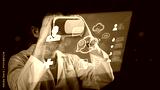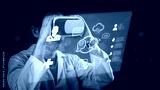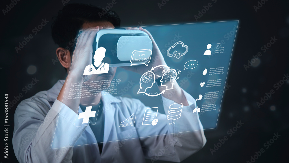 Medical professional explores future healthcare using VR headset, interacting with holographic interface displaying patient data, AI assistance, and innovative diagnostic tools.