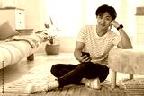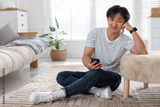 Handsome Asian man with smartphone on floor at home