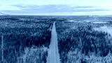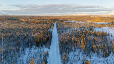 Aerial view of beautiful winter landscape in Lapland during sunset.
