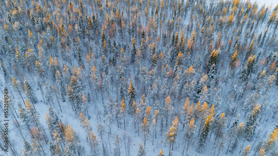 Aerial view of beautiful winter landscape in Lapland during sunset.