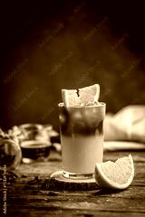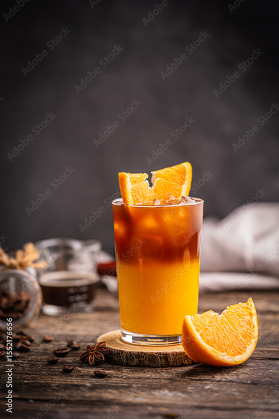 Coffee with orange juice (bumble) in a tall glass with ice on a dark background with coffee beans and fruits and morning shadows. Trendy summer Asian refreshing drink. High quality photo