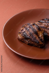Grilled beef steak meat with salt and pepper. Beef steak grilled on a barbecue