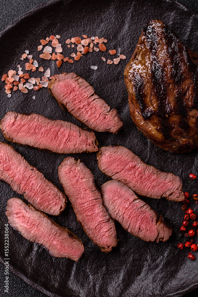 Grilled beef steak meat with salt and pepper. Beef steak grilled on a barbecue