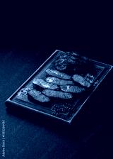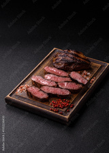 Grilled beef steak meat with salt and pepper. Beef steak grilled on a barbecue