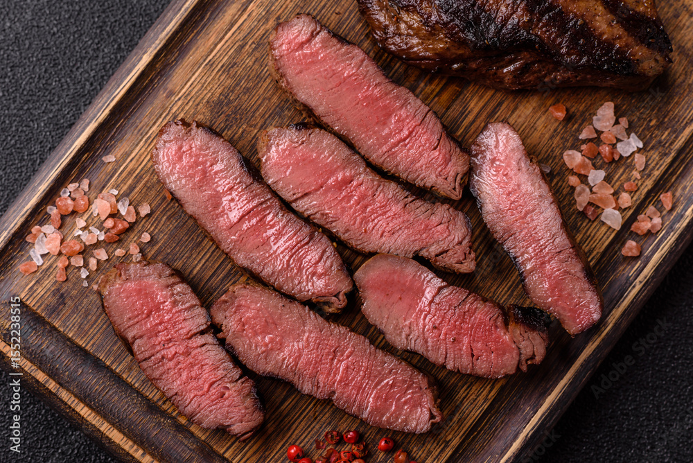 Grilled beef steak meat with salt and pepper. Beef steak grilled on a barbecue