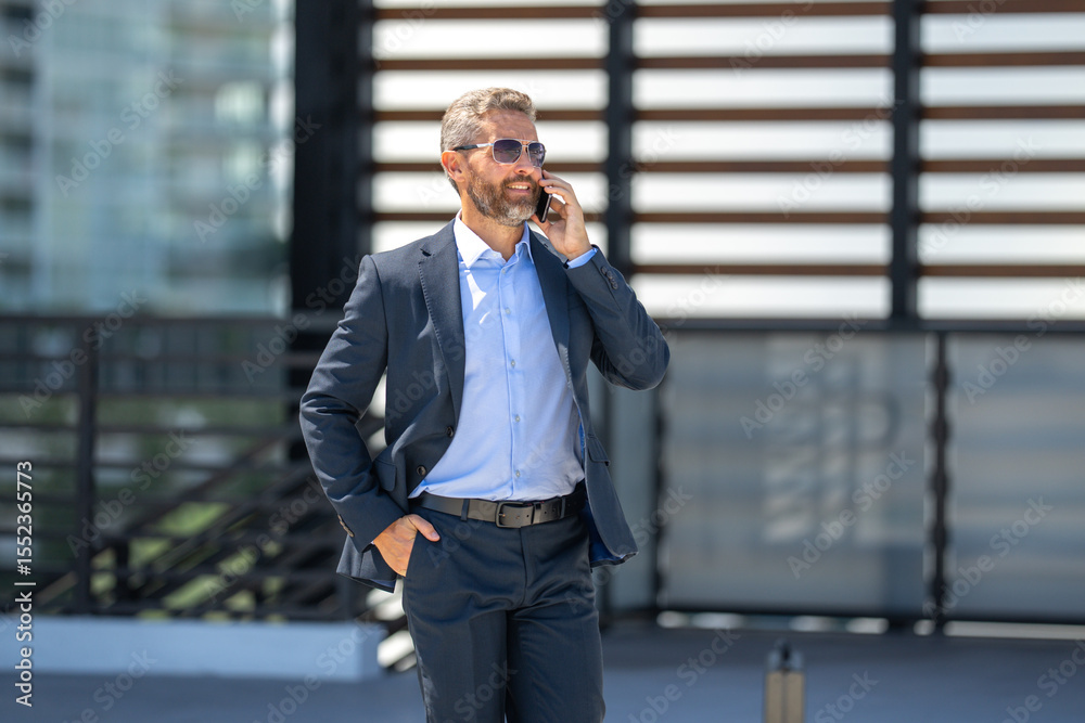 Businessman walking and calling on phone. Confident business man outdoors have important call. Business call phone conversation. Busy boss talking on call phone. Rich business man. Business call.