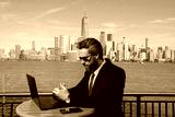 Successful USA businessman. Man using laptop outdoor in New York City. Business success. American business dream. American businessmen in suits with laptop near Manhattan. Online business in US.