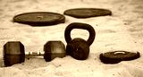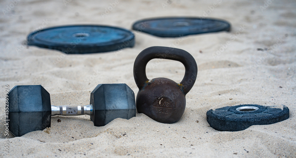Kettlebell and weights background. Bodybuilding with heavy weights. Park workout with dumbbells. Sports scene with weights. Kettlebell, dumbbells and barbell background. Weights training outdoor.