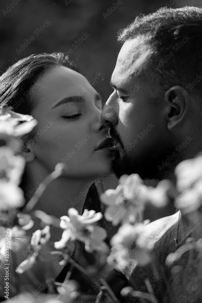 Portrait of young couple kissing. Couple kissing, close up. Sensual kiss. Tender kiss. Couple in love kissing on the nature. Sensual kissing.