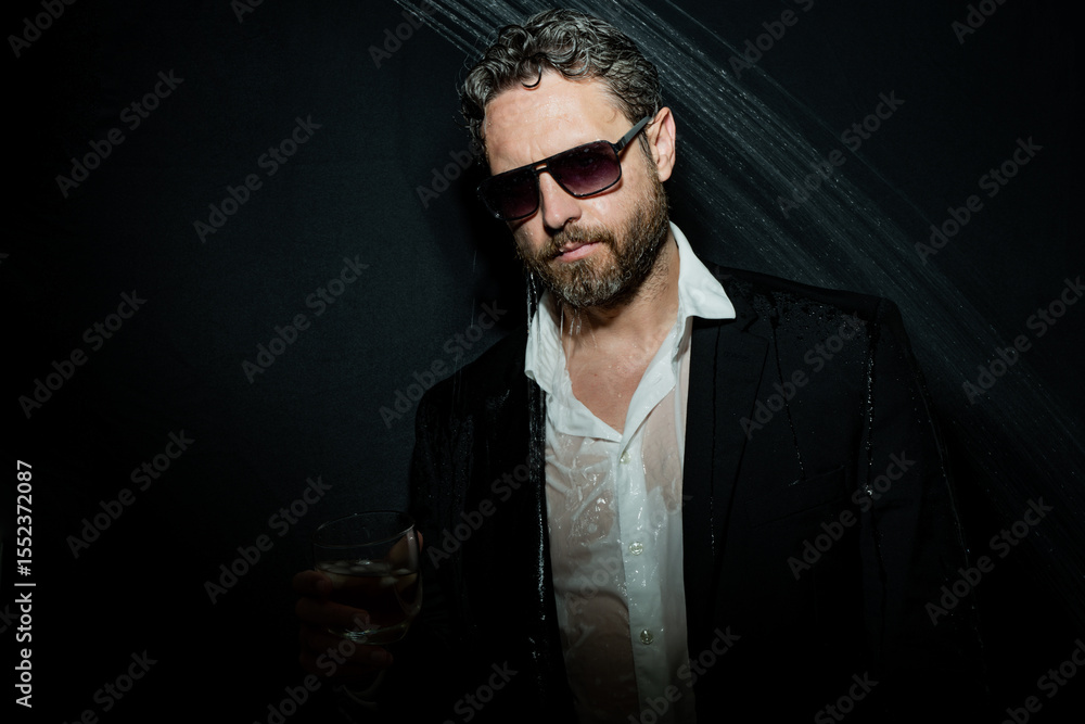 Stressed businessman in suit in bathroom after crisis business. Man drinking a whiskey after stressed office work. Business stress. Alcohol and drugs. Stressed business man under shower in bath.