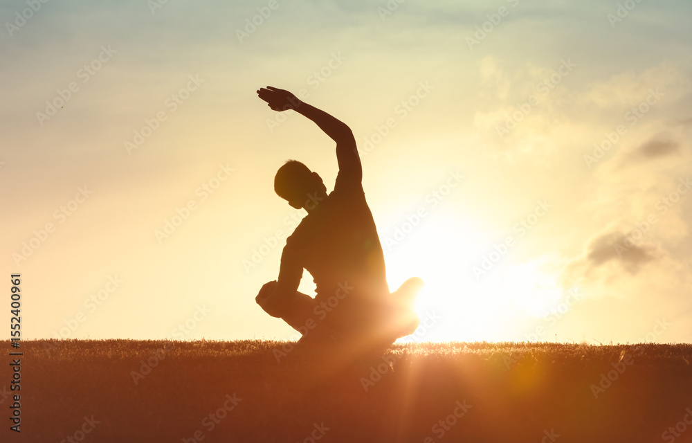 Young man stretching and practicing yoga at sunrise. Recreation, self care, yoga training, fitness, exercises, relaxation, healthy active lifestyle concept