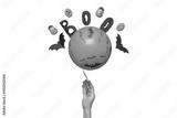 Handheld orange balloon with Halloween decor, isolated on white, PNG
